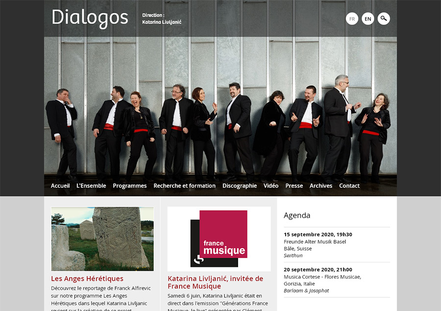 Dialogos Ensemble for medieval music. Katarina Livljanić, Director. Paris (2006, redesign 2014) Joomla!® content management system Languages: French, English Previous / Next