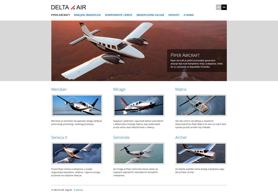 Delta Air Tvrtka za trgovinu letjelicama i distributer rezervnih dijelova, Zagreb (2014) Sustav za upravljanje sadržajem Joomla!® Jezici: hrvatski, engleski Natrag / Dalje