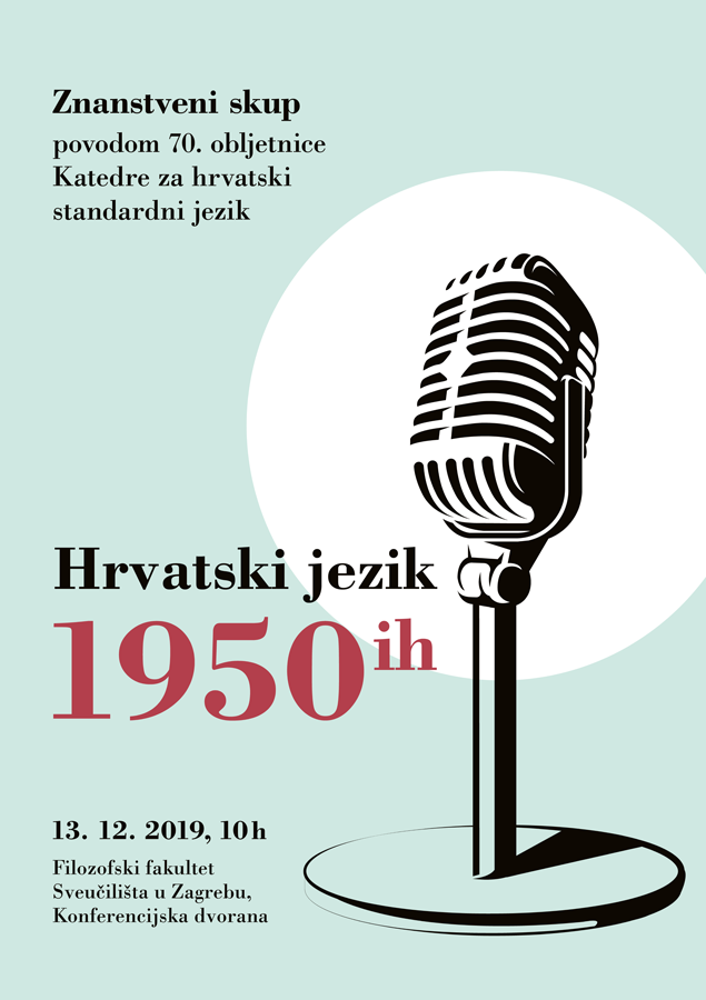 Hrvatski jezik 1950ih Plakat i program za konferenciju Odsjeka za kroatistiku zagrebačkoga Filozofskog Fakulteta (2019) Prihvaćeno i alternativno rješenje. Dimenzije plakata: 50 × 70 cm. Natrag / Dalje